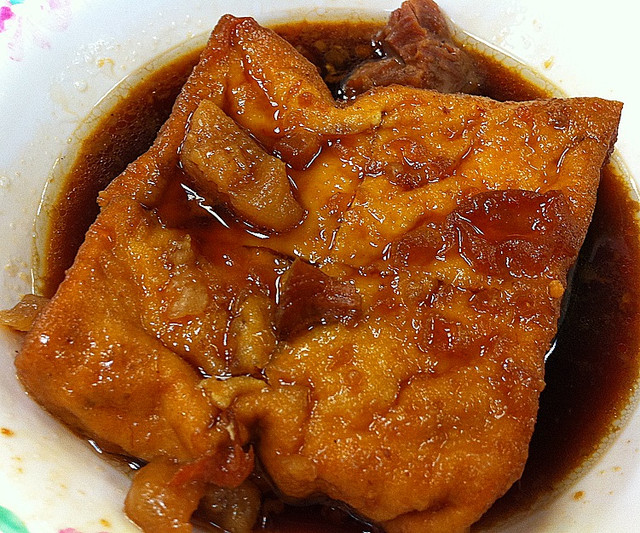 炸豆腐,裹上薄薄的粉經高溫油炸,外香酥 內滑嫩